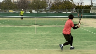 山陽ベテランQFはランキング5位の鉄壁ストローカー。終始主導権を握られポイントパターンが見いだせず2-6、4-6のストレート負け。ポイントによっては通用したショットもあったので、格上選手との対戦では各ショット精度を一つ一つ上げていくしかない