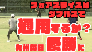 九州毎日ベテラン50才ダブルス2Rは一昨年の王者。1stセットをほぼ完璧でリードするも、2ndセットで流れを渡し、逆転負け。ダブルスはシングルスより流れ、波が大きく簡単に変えられない。0-5でも3つ返し、ファイナルにつなげれたことは成果