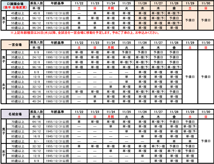 - グラスコート同様に要項で詳細日程が記載され、3連休もあって、会社員には参加しやすい大会
