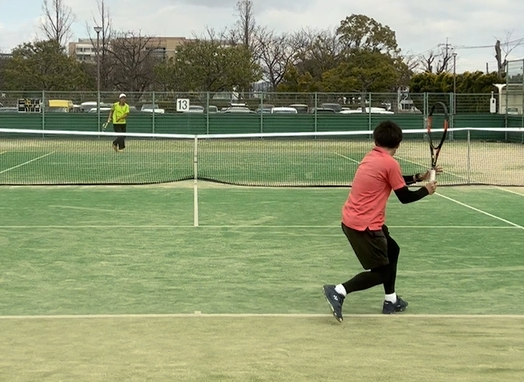 この日は強風で、スライスはコースが定まらずやや不利、しかしコートは滑るので有利な面も、まずはフォアスライスとストローク対決をしてみます